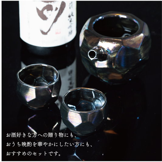 【お中元・夏ギフト】有田焼 ラスター彩 日本酒晩酌3点セット 黒色 (ぐい呑み2個、片口1個) 喜鶴製陶