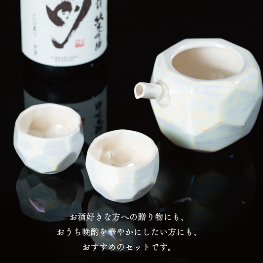【お中元・夏ギフト】有田焼 ラスター彩 日本酒晩酌3点セット 白色 (ぐい呑み2個、片口1個) 喜鶴製陶