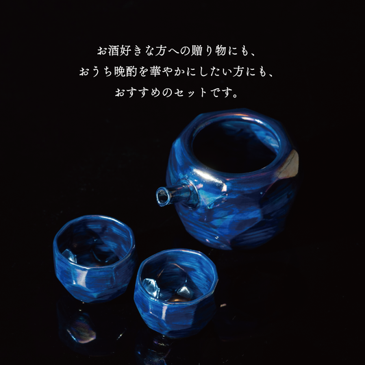 【お中元・夏ギフト】有田焼 ラスター彩 日本酒晩酌3点セット 青色 (ぐい呑み2個、片口1個) 喜鶴製陶