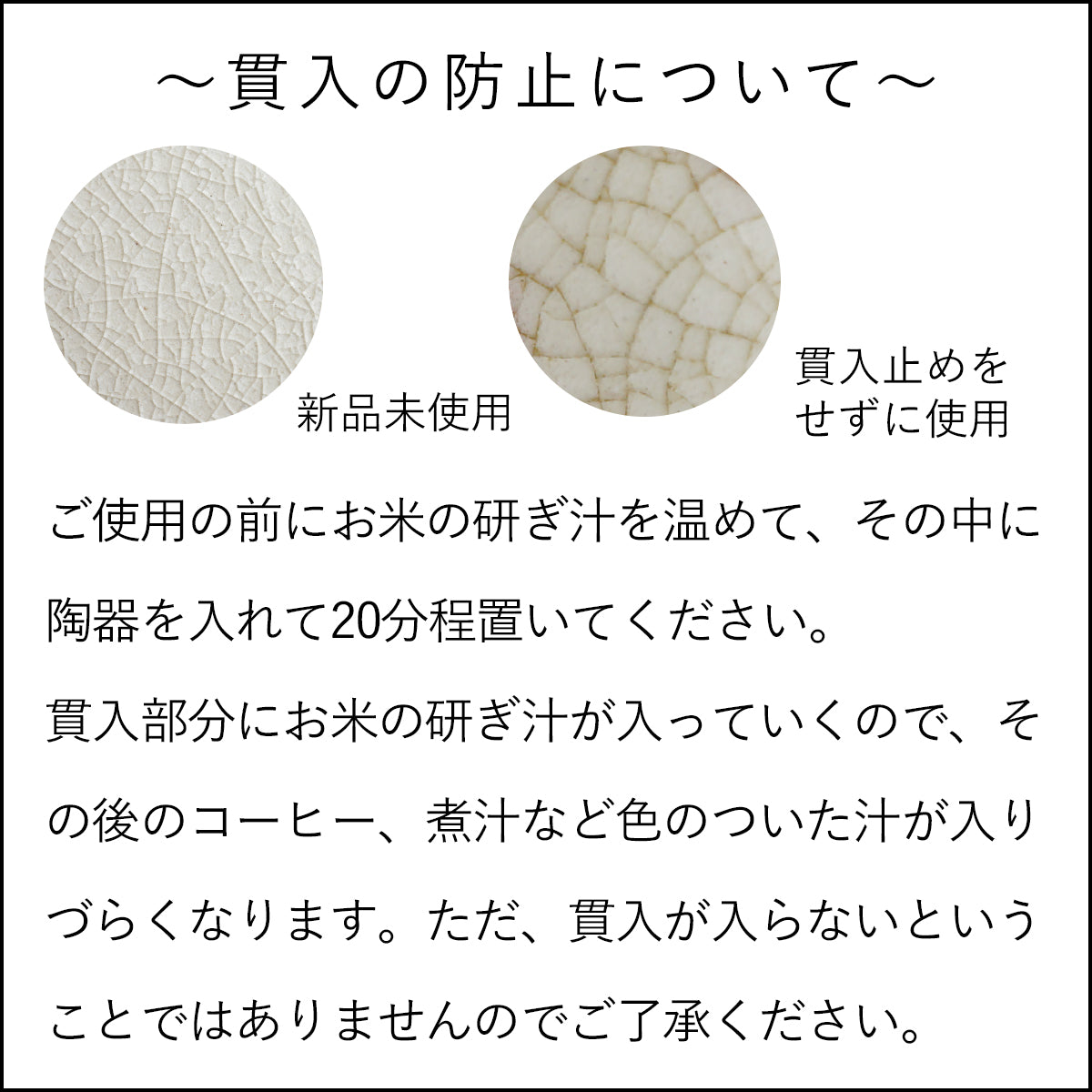 ご使用の前にお米の研ぎ汁を温めて、その中に陶器を入れて20分程置いてください。貫入部分にお米の研ぎ汁が入っていくので、その後のコーヒー、煮汁など広のついた汁が入りづらくなります。ただ、貫入が入らないということではありませんのでご了承ください。