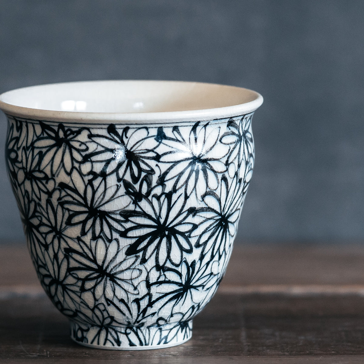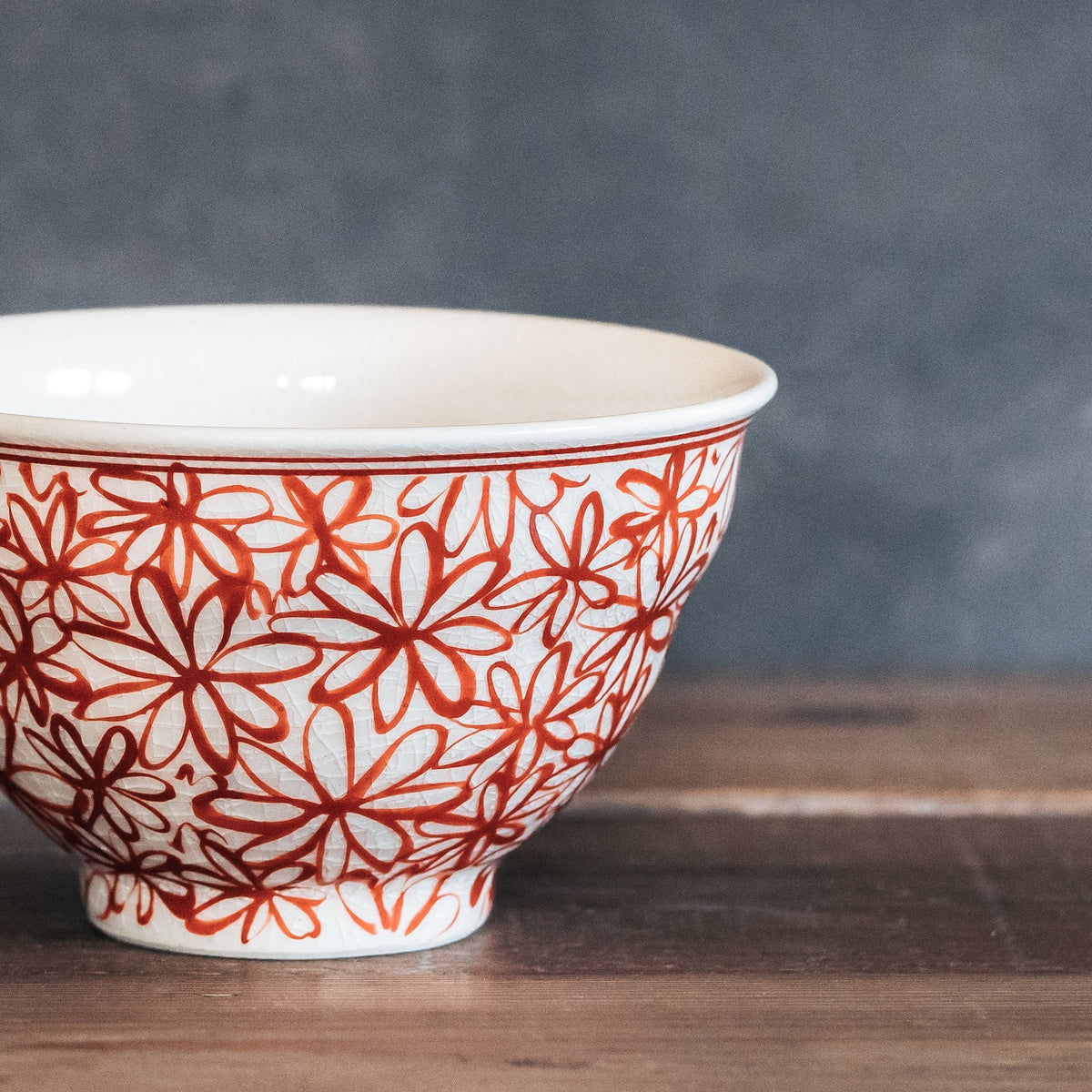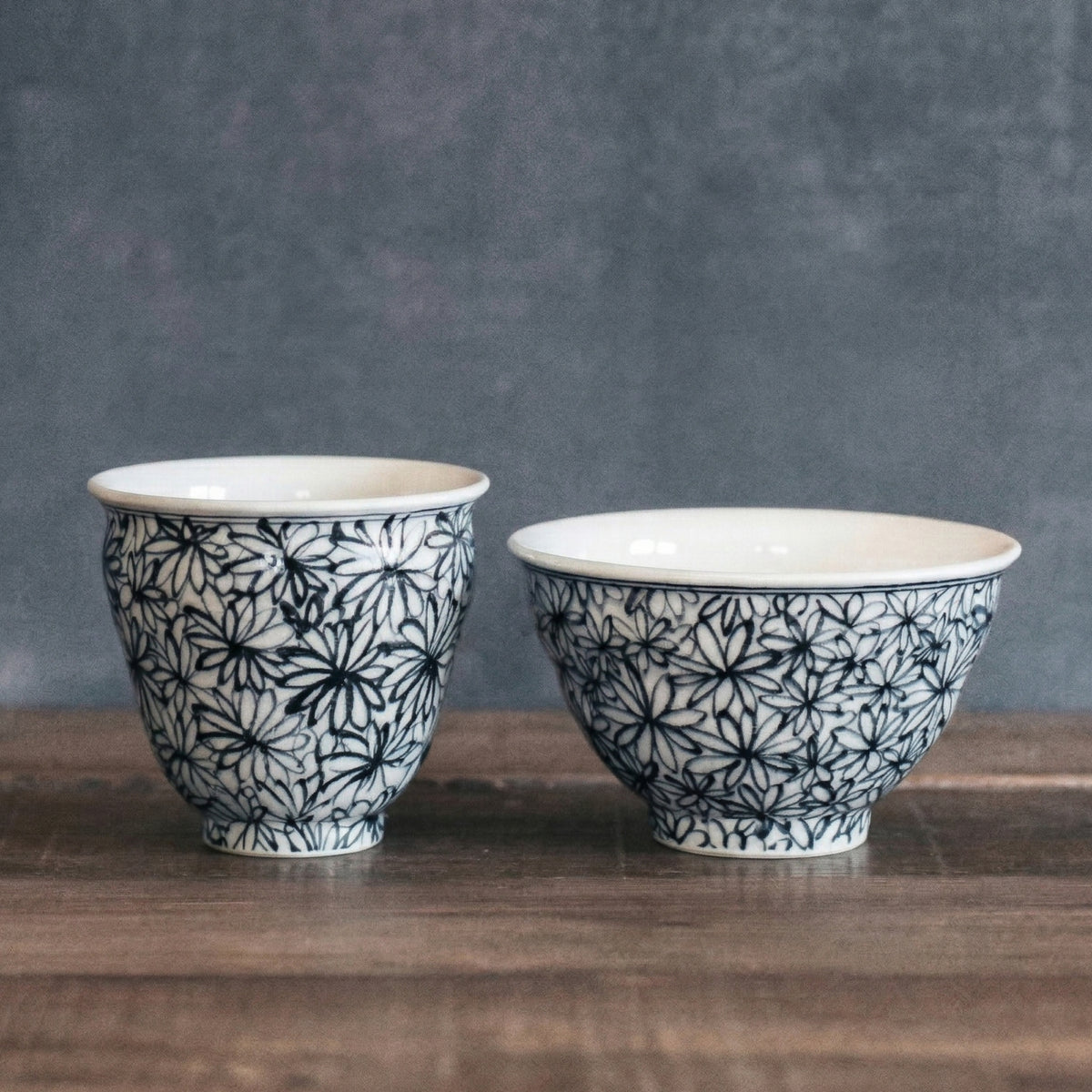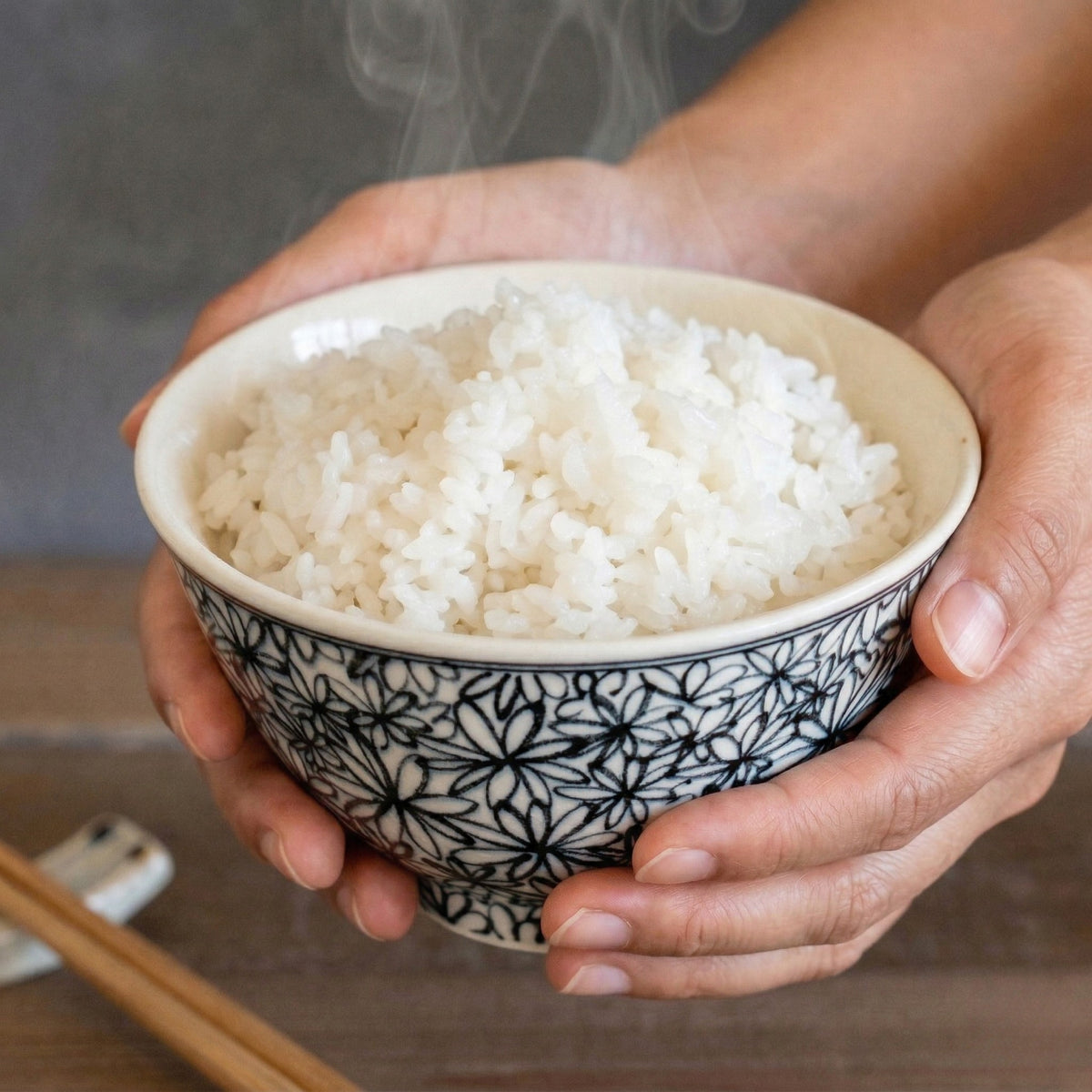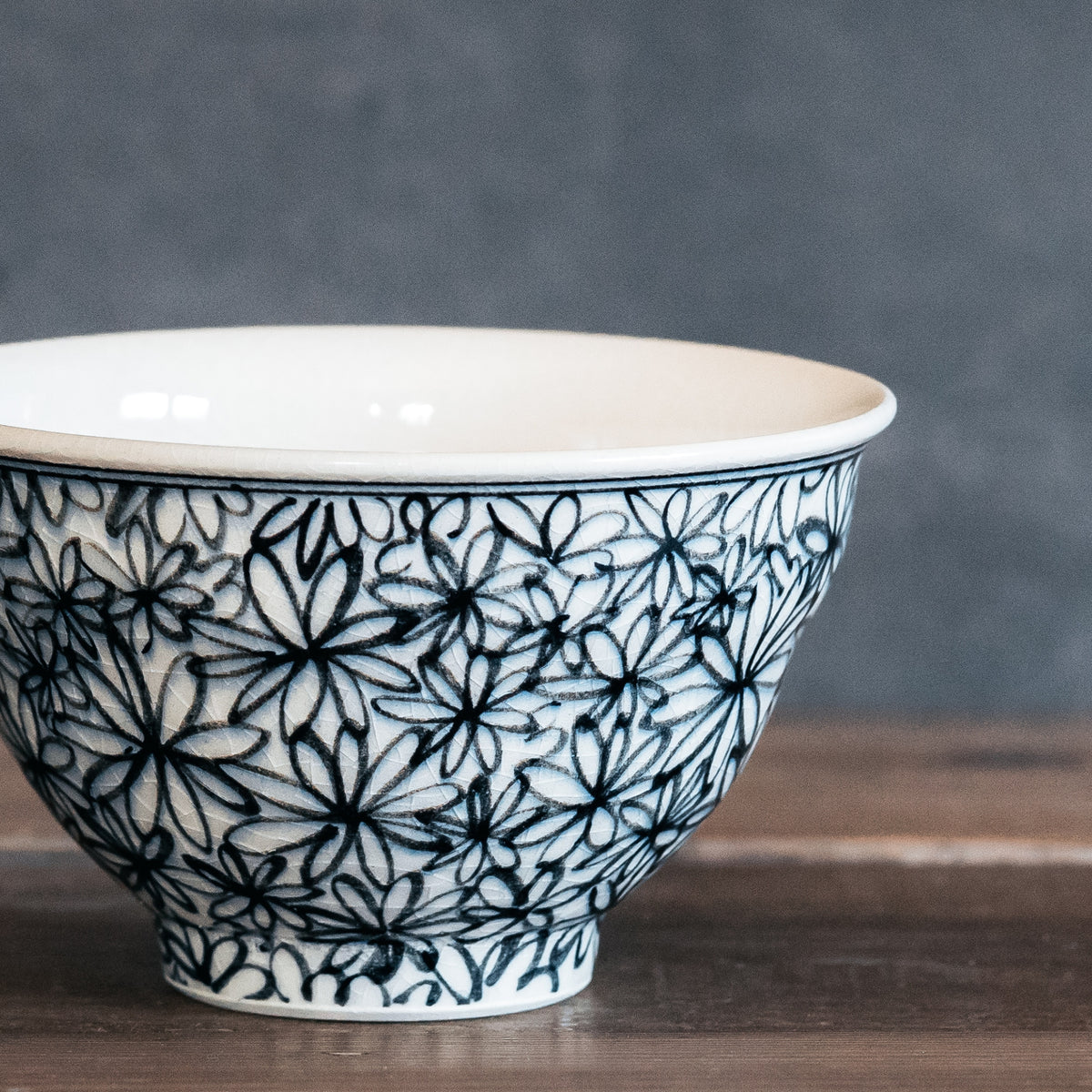 花詰模様を描く呉須には、あえて彩度を抑えた「渋み」のある絵具を選定しています。そこに和のやわらかさを感じさせる独自の釉薬を重ねることで、派手すぎず、かといって地味すぎない、食卓にスッと馴染む落ち着いた佇まいに仕上がりました。 主張しすぎないけれど、いつもの白米をより美味しそうに見せてくれる。そんな確かな存在感を持った器です。