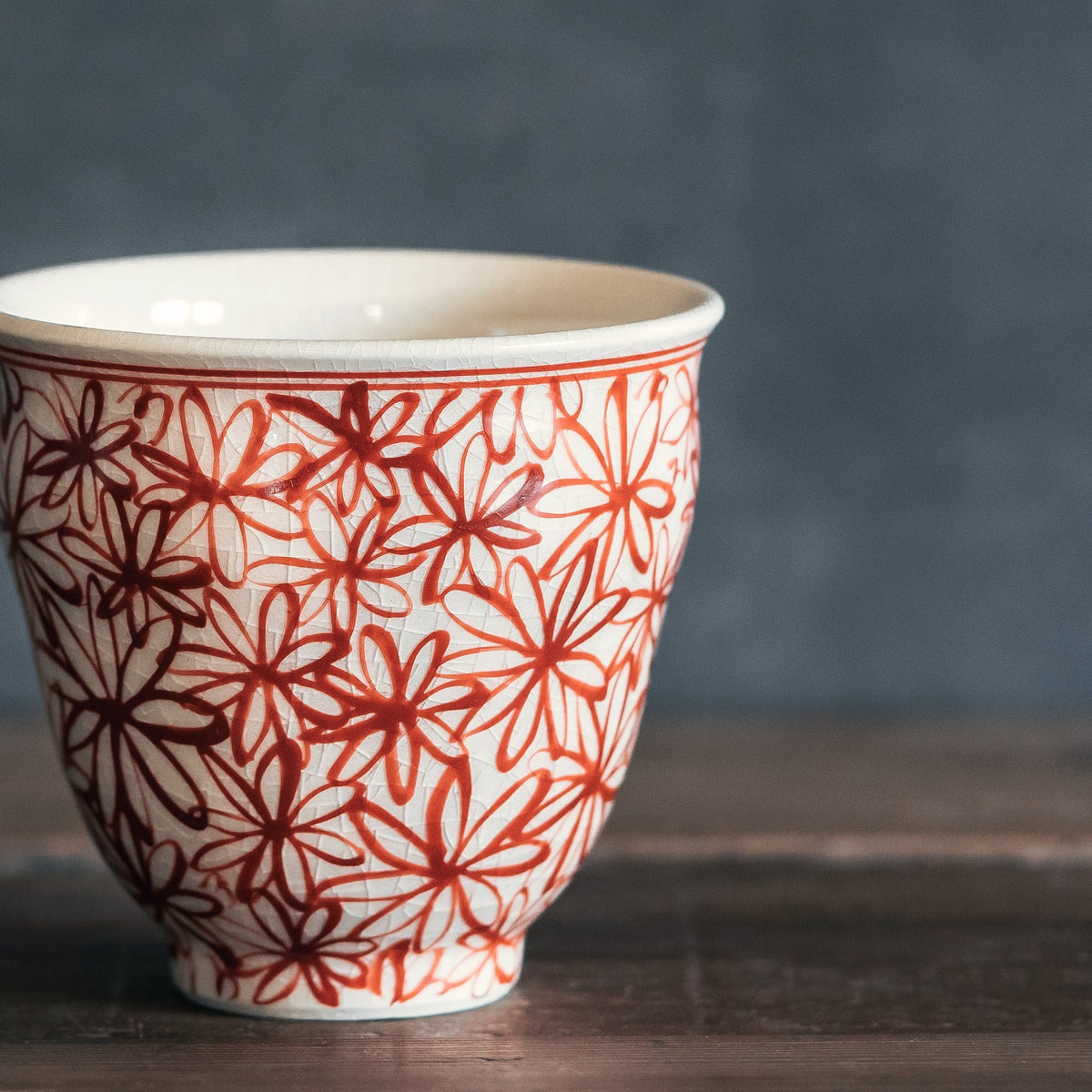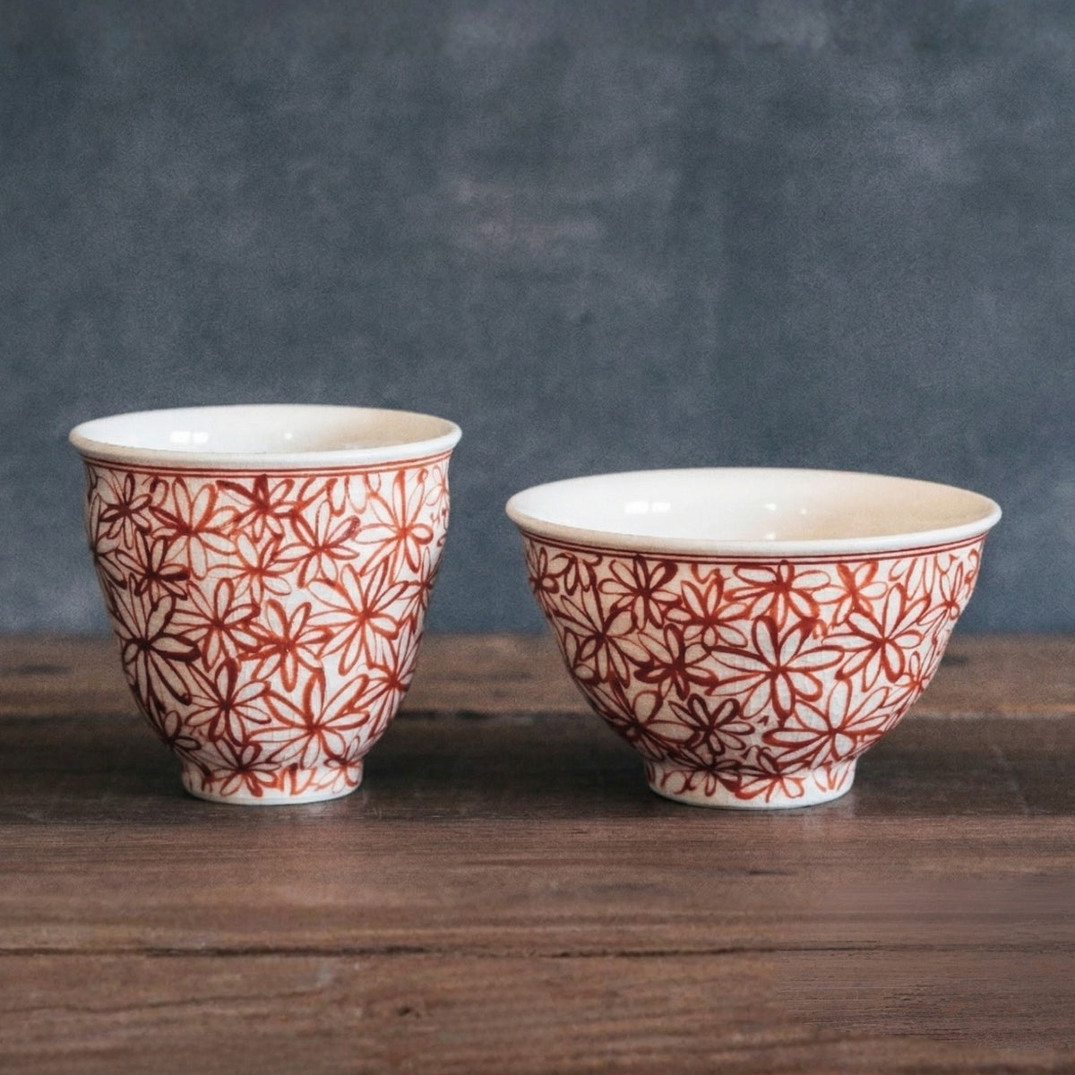 器を彩るデザインを手がけるのは、作家・山口祥治。彼の作風が持つ、和の伝統の中にもどこかエキゾチックで独創的なエッセンスが、この器にもしっかりと息づいています。 器一面に広がる「花詰(はなづめ)」模様は、量産品のプリントではありません。職人が一つ一つ筆を執り、呉須(青い絵具)を乗せ、赤絵を差していく「手描き」によるものです。筆の入り方や色の重なりから感じられる確かな手しごとの跡が、器に豊かな表情を与えています。